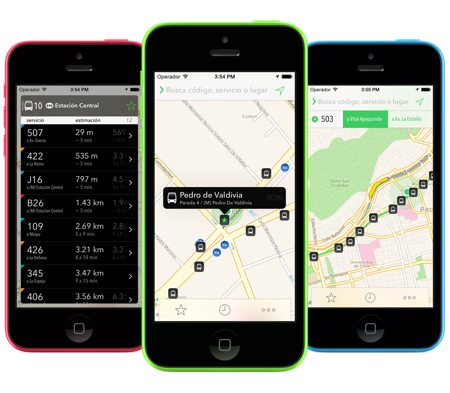 The first and then-best public transit app in Chile. Thousands of people relied on it every day for bus arrival estimations, bus routes, fare card reloading places, and more.