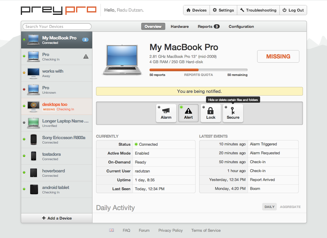 Prey is an anti-theft system for personal devices. Worked with Tomás Pollak on a full redesign of Prey's Control Panel. My first foray into more complex web apps.