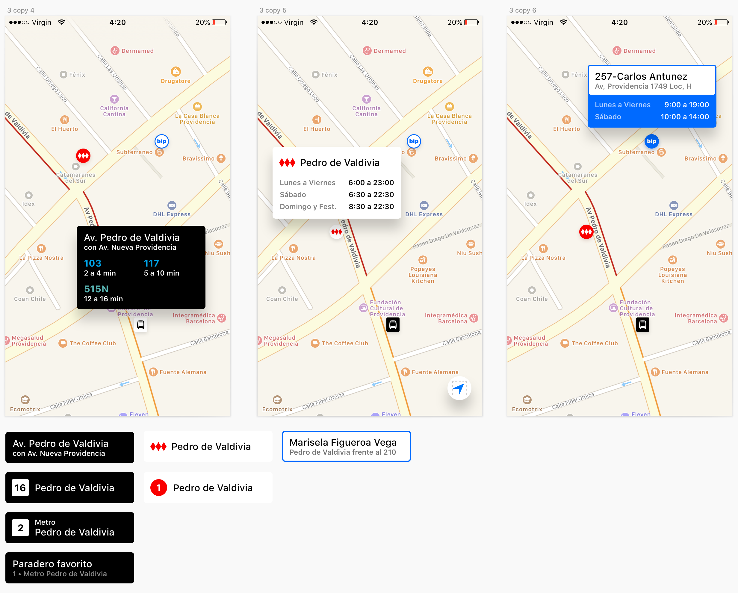 The first mocks for Cromi (below) were made with real data obtained through the API, which besides stops, also included subway stations and places to reload fare cards. The designs revolved around the simple idea of using map callouts as the key information delivery mechanism.