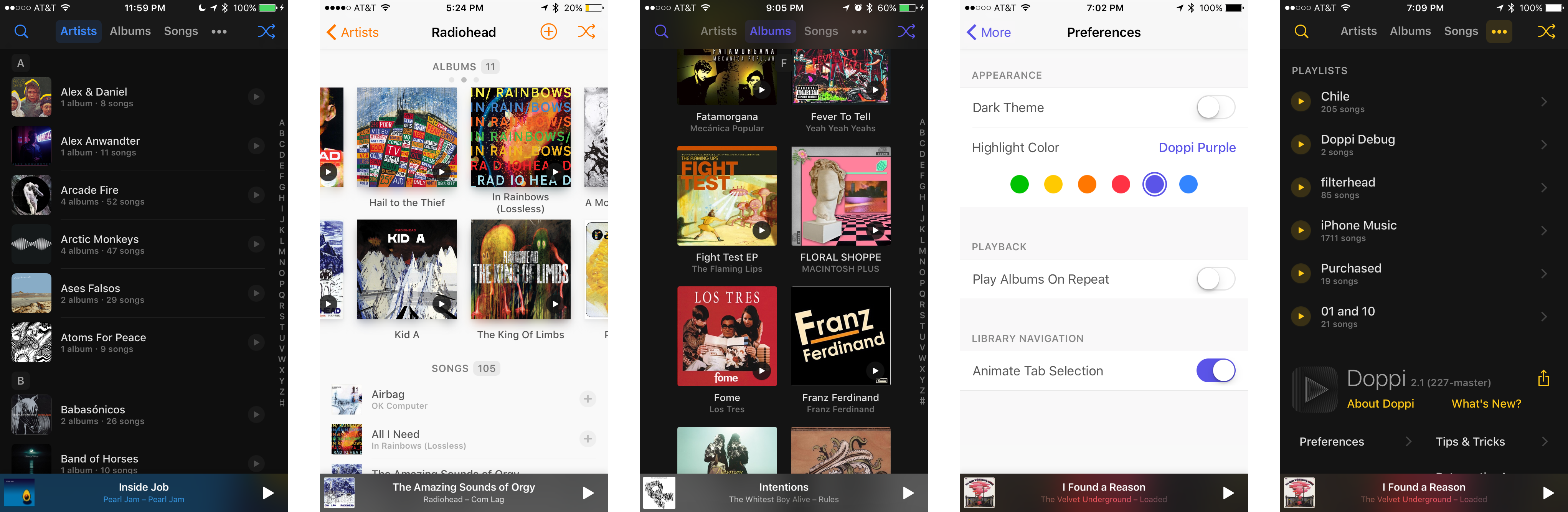 A key advantage was enabled by a very early decision that carried over from 1.0: the appʼs default background was a very light shade of gray, meaning that white elements subtly stand out. I borrowed a page from macOS, where zebra-style lists are abundant and make for a pleasing scanning experience on the densest of lists, and made all song and artist lists alternate between the default content background and white.